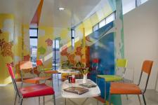 The wall has openings that allow natural light and ventilation to the interior of the rooms. These openings are cut with a 3 degree inclination and appear both from the floor and the ceiling even cutting the foldings. A series of lines appear from these openings expanding in white to the outside and converging in different colors to the inside. These lines continue on to opposite walls to emphasize the continuity of the surfaces.
