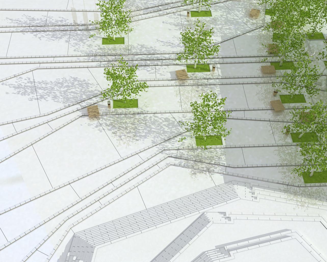 The size of the square is not relative to the population and the size of the small city. Therefore, the difference in the plot levels is used to devide square to the smaller parts At the same time the artificial relief will stop the dissipation of the square and form the multifunctional plateau.