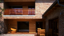 The mass of the brick-house built at the Brook Szilas rises towards the street and the sideyard as a castle-wall. The streetside wing of the “L”-shaped building of mono pitch roof is one-storey, the backyard-wing extending for the back is two-storey. The community places are situated on the ground floor as well as the parents’ bedroom and the double garage.