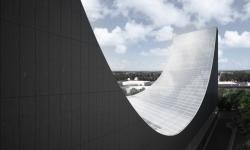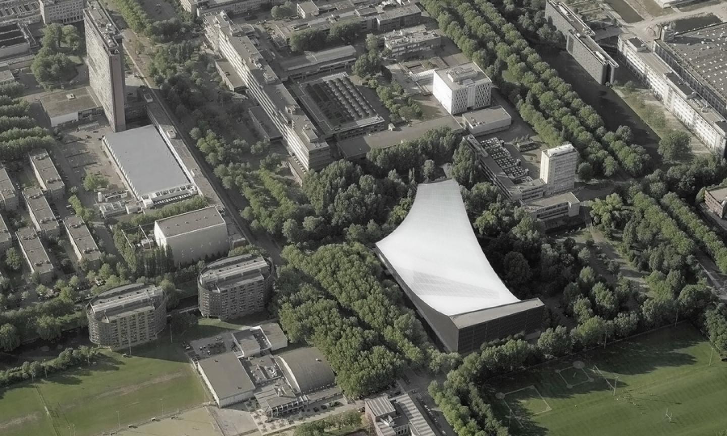 the new bouwkunde building has been designed as an eleven storey building with two volumes connected by huge, curved glass structure. this s several possibilities to decrease costs of maintenance. almost half of this surface is covered with solar panels. it gives almost 1500m2 of photovoltaic cells, which produce 4000kwh per day. by dint of this structure it was possible to a double façade circulation system. this increase efficiency of ventilation and gives natural insulation to the building. façades are covered with fibre c concrete panels and some of them are openable.