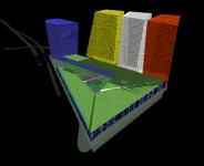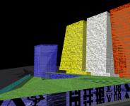 …a continuous large-scale structure located on a heavy traffic highway, acts as an icon that triggers urban development in the area. A dynamic triangle occupies the whole span of the site while three colored prismatic towers establish an architectural backdrop.