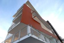 The building is made of reinforced concrete over the foundation shovels with the plugging as a package. It’s also covered by concrete plaster, and the frontage which has been made of Klinker. The typology is that one like a balcony: this architectural elements is underlined on the prospect from the red coloured scenic fifth; it does work as a connection between the volumes. The stairway sector is an opened space included in the scenic fifth; but is highlighted by sun breakers that are used to protecting from the atmospheric agents. The elevator room is an independent block that emerges from the construction. The trapezoidal form of the building is led by plot condition. Such irregular surfaces have been exploited for creating the spaces for the service as: stairs, balcony and balconies, unlike the plan of the estate single units that has a regular geometry.