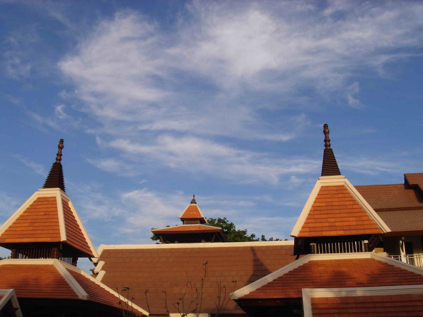 the deeply-pitched roofs and open-air pavilions (sala) that characterize traditional Thai architecture evolved in response to the country’s climate. a high roof s an interior with enough space for hot air to rise. the roof overhang keeps the sunlight out. a second steeped roof promotes ventilation by trapping the hot air in the space above. in ancient Thailand, sala were open to the outdoors and were where thai people received guests. they also came to the sala to enjoy the cool outdoor breezes and gaze at the countryside around them.