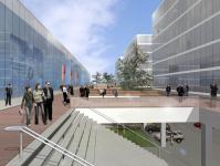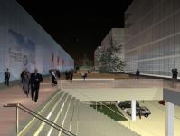 the cross media city covers the main s of the media park moscow, e.g. production facilities, offices and services. the ring road encloses this media park core, providing the core with rigid boundaries, emphasized by 7.5 m elevation of the whole area. the deck not only provides room for parking spaces, storage and technical facilities underneath but also strengthens the accessibility of the studios.