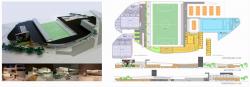 the idea was to hybrid sports building which includes stadium, sports hall, and olympic swimming pool. method used is adaptive geometry which s virtual volume from which open sports grounds are cut off.