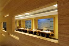 the other f & b outlet is latitude, a multi-cuisine restaurant situated at the first floor. long continuous wraps of stacked plywood float within this restaurant forming alcoves of varying scales juxtaposed against each other to varying compositions of form as one moves through the restaurant and creating individual identities for the space within.