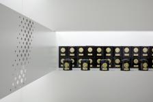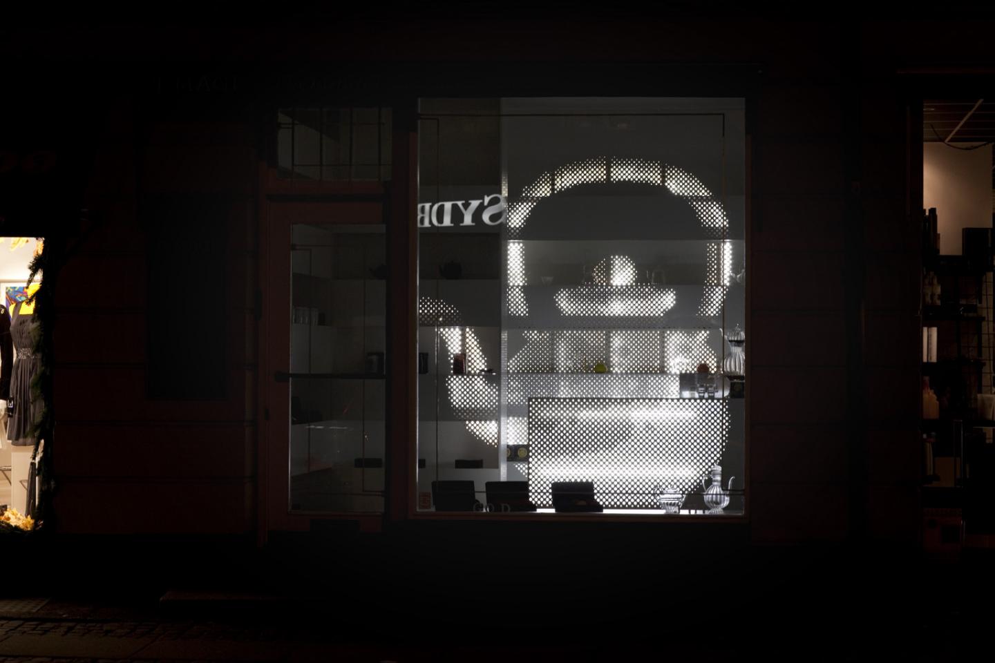 Tiny holes in different sizes are perforating the shelves in the back wall. The holes provide a large 3 dimensional image of a teapot. In the evening, the Teapot glows in the dark, attracting people’s attention. Seen from the street the whole teapot shows. As you move closer and around in the shop, the teapot will distort into smaller light fragments.