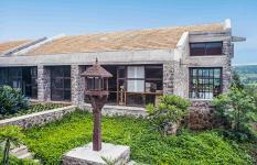 The east and west parallel walls of the rooms are sliding glass panels. Stone walls are selectively pierced with windows which frame views in the valley below. These are protected by concrete boxes from rain and sun.