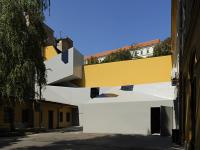 The only new architectural element of the centre is the new entrance lobby, a polyvalent space in the service of communication and meeting with a cafe, library and a video store. It was interpolated on the basis of almost default parameters of the existing neighbouring houses. The volume and its broken also form suggest dance movement and they are a new sign and connection element between the courtyard and the roof terrace. The roof terrace is the final element of the centre and an important part of the project of preservation and restoration of Zagreb last open roof stage.