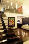 A horizontal box intersects the main Box provoking a tension between them and solving at the same time the activitiy flows and articulation between the areas. There is a gallery to display the client’s collection o paintings. The access is emphasized by a floating surface that sticks out from the facade and runs into the system creating a distributor next to the main Box. All the bedrooms are opened to the lake sight and are linked and connected by a transparent platform that floats above the exterior garden. The roof of the horizontal body is used as a terrace covered by