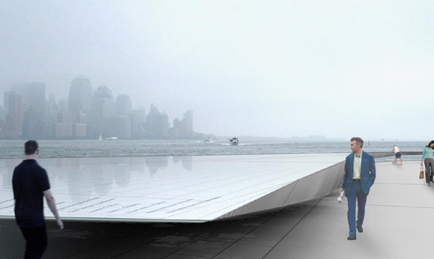 In our entry for the invited competition to create the Hoboken 9/11 Memorial we sought to bring back the moment of intense connection between the Hoboken pier and the Manhattan skyline. We proposed that a narrow stream of water would flow along the southern edge of the pier from the city of Hoboken towards the Hudson. The handrail gradually widens as the water traverses the length of the pier, guiding the visitor to the waterfront edge. At the end of the pier, the stream fans out into a still reflecting pool. The Manhattan skyline is reflected on the surface of the water, conveying both the glory of the human endeavor and the place of the fallen towers. The memorial acts as a symbolic object and a device for personal visual and emotional reflection.