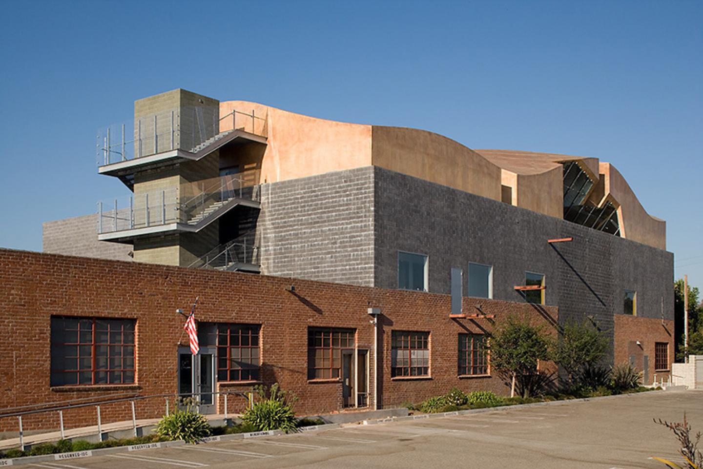 The original, one story brick warehouse, built early 1950’s, is located just east of the now abandoned Southern Pacific Railroad right-of-way which serviced the building directly. A two story masonry box at the west end of the building was added in the late 1990’s, replacing a portion of the original brick structure, which is used as office space. The double floor height addition to the original building is a new sound stage and studio for use by film production companies in the area. The recently completed third floor addition is placed on top of the sound studio, providing space for additional offices for a Los Angeles entertainment and sports cable television station.