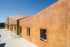 Extensive research and testing was necessary to develop the appropriate balance of resin, color, texture, substrate, and material strength in the fiberglass. Several 12 foot by 12 foot test panels were constructed on site to evaluate the on-site spray application of the fiberglass, to study the application techniques for corner and edge conditions on walls and roofs, and to secure expansion and contraction data, insuring that the fiberglass system would perform well, as the weather and local temperatures varied over time. Half-round ridge-bumps, analogue topographic lines, were placed horizontally along the sloping roof, to slow and re-direct the flow of water off the roof.