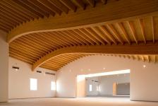 Because the entire wood structure – beams rafters, and plywood – is exposed on the 3rd floor interior, the roofing construction must insulate the roof. The roof is composed of a plywood shear diaphragm, with rigid insulation next, then fire resistant cement board sheathing on top. The finished surface, applied over the cement board, is a translucent, on-site, spray-applied fiberglass material, developed specifically for this project, to waterproof the entire external surface of the building, and conform seamlessly to its unique curvature. The spray-on, site-applied fiberglass is used in this project for the first time.
