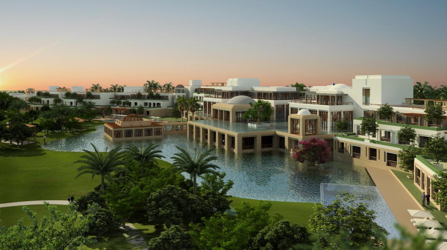 The concept for the Taj Exotica Resort on the Doha Golf Course has been developed as a stepping, terraced 3-storey hotel of 150 rooms, based on a concept done previously for a sloping site elsewhere on the Golf Course. This particular site is flat; therefore the terraced section was achieved by placing fill and artificially creating the effect of a sloping site.