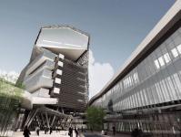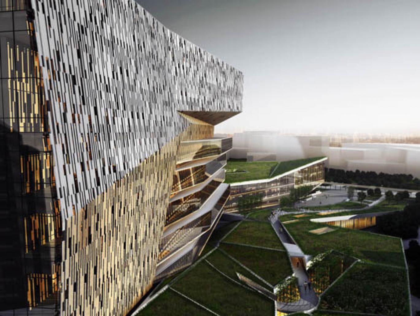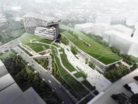 As a literal extension of the green belt, the CDC orients itself around a large public courtyard, becoming the symbolic gateway into the Hsinchu Biomedical Science Park. Its embracing form welcomes visitors arriving by train and on foot, and spurs interaction between researchers and the public. Furthering the team`s desire to transform the building into a sustainable public amenity, the green belt lifts to become a highly visible and occupiable landscaped roof, and in doing so, maintains the equivalent of nearly the entire site as open space. The plaza and roof are woven together with a public recreational path that ascends the landscaped roof, affording glimpses into the inner workings of the CDC and symbolizes the cooperative working ethic integral to its success.