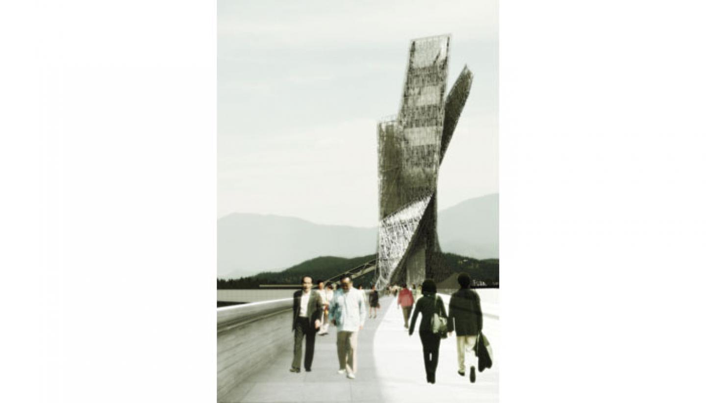 The Miyi Tower rises from the southern end of a kilometer long promenade that stretches from a high density residential and cultural hub devoted to regional arts. The promenade itself consists of a series of parks and public spaces designed by SWA Group to highlight accessibility to the river. It then tapers between rising paths which form the amphitheater at the tower’s base. The paths converge and then continue as a bridge across the river and as an overlook affording views of reclaimed wetlands and the lake beyond. The designers were intent on utilizing natural and mechanical means of filtration to produce clean water, converting a highly polluted river into a usable amenity for residents and visitors. This new amenity takes the form of a series of lakes, wetlands and waterways which lend form to the new districts in the master plan.