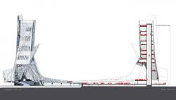 The tower itself, which is to act as a major landmark per the Miyi government’s request, is designed as an educational building for residents and the multitude of tourists that visit every year. Because the town is known for its abundance of sunshine and temperate climate, only half of the building’s program elements are enclosed. These double height spaces alternate with unenclosed areas and rise around a vertical core, their alignment shifting toward different views at every floor. An auditorium, exhibition spaces and restaurants featuring local cuisine can be found on the interior while open-air floors are used as event spaces, gardens and an observation deck. The pairs of lower and upper enclosed spaces are joined by structures which act as light monitors. These light monitors, of which there is a third at the highest level, are aligned to take advantage of different lighting conditions throughout the day.