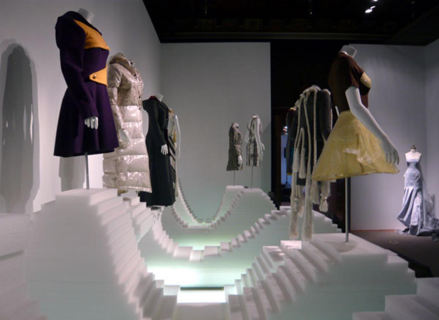 Constructed out of art packing materials, the design for “Off the Wall” follows the concept of the exhibition where traditional materials—the museum’s permanent collection or its music archives—are recycled and reinterpreted to create new works of art. Similar to the way art reinterprets the content of the museum, its art collection, the design reinterprets the context of the museum, its art handling and shipping. The foam and cardboard from the back rooms of the museum are brought to the front of the house and into the space of the gallery, giving new meaning to the internal mechanisms of the museum. In a literal translation of the exhibition title, the design provides not only “Off the Wall” platforms for the display of the art but also for the artists at work. Three different materials were used in the three galleries responding to the type of art in each space: : - The Pixilated Mattress - A landscape of gray foam blocks, for the sound artists and a lounge space. - The Pedestal Mountains - A tactile series of pedestals from white ester foam, which heighten the materiality of the fashion design and multimedia art display.