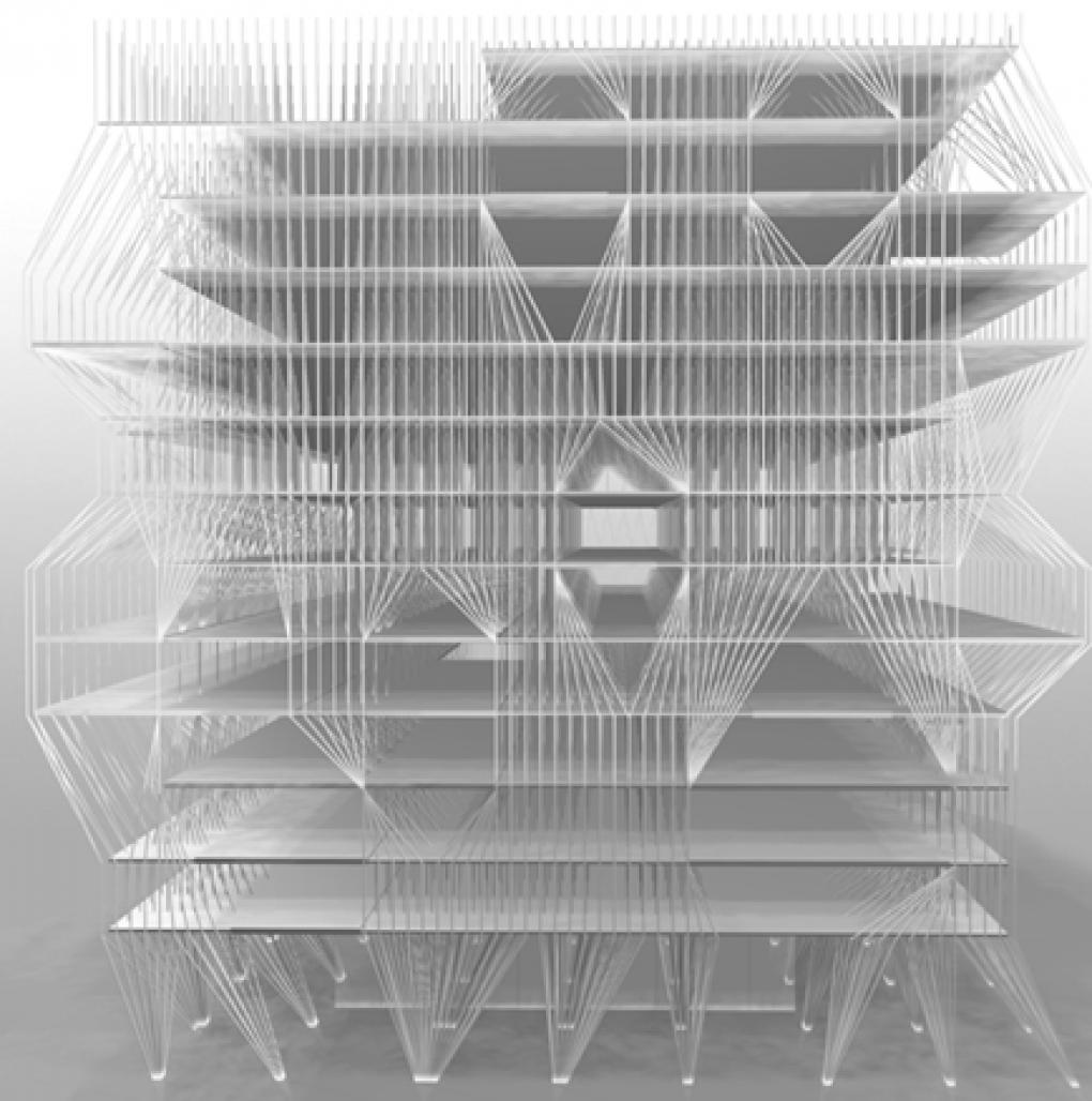 Using the bookshelf as the module for the building, the structure is based on a dense grid of columns 1 Meter x 2.25 Meters apart. The structural column grid supports both the bookshelves and the building as a whole. The office floor plates project out from the book storage core and create modulation on the façade revealing the areas of human activity on the building`s exterior skin.