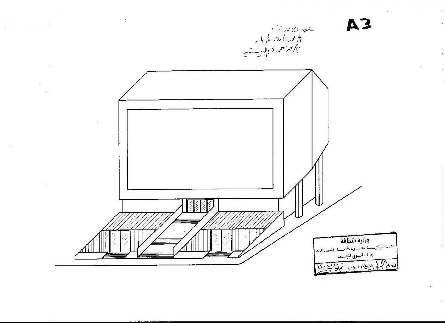 , Using the screen in block form of the project and the keyboard was used in the entrances and also a venue open seats buried in the ground in front of the building where the vacuum using a mechanical movement chairs appear from under the grass and also the industrial use of the theater is in the form of metal chips come out from the bottom of the computer screen and the theater shows a way mechanical theater is a non-permanent appearance is only when in use, however, clear that visible. the building are as follows: Club information technology and global electronic networks