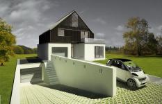 There are 2 parts of the building – ground floor made of bricks which is a solid foundation. That part shelters 2 garages with workshop, open living space and kitchen. Second part of the building are light upper floors made of prefabricated wooden panels, superposed on the bricked base. That is a private part of the house. The system of wooden slides gives a flexibility of use. On the attic is located chill out area with a panoramic view on the Bay of Gdansk. Both parts are connected by round staircase.
