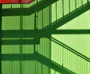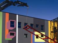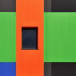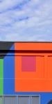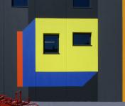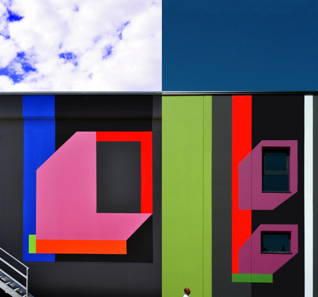 The ground floor is used as a storage, while the first floor is dedicated to offices and it’s served by two opposing staircases and elevators in steel frame, covered by enameled and perforated steel panels. The facades of the entire complex, except for the entrance one, are painted in dark gray. A series of highly colored and abstract designs, in a very large scale, have been placed in visible point to create a unified image and a strong impact, that strongly recalls the image of the company itself.. The decision to intervene with the color allowed the building to emerge from the typical architectural anonymity of the surroundings and, at the same time, it advertise the company, specialized in paints. The client immediately loved the idea. Aware that such a difficult chromatic intervention would have required a skilled performer, we asked our client if he knew a capable one for the intervention. He said he would have called Giotto…. Sure that this was a simple joke, we met on the building site a bit worried. The client presented us the painter and he’s name was really Giotto!!!