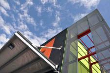 For the shop window, visible from the street, we created a conceptual intervention. So on the dark background we placed a 30 m long stripe, made in enameled aluminum panels, reproducing big folders of Pantone colors. The system has been turned over to the corner on both sides of the building.