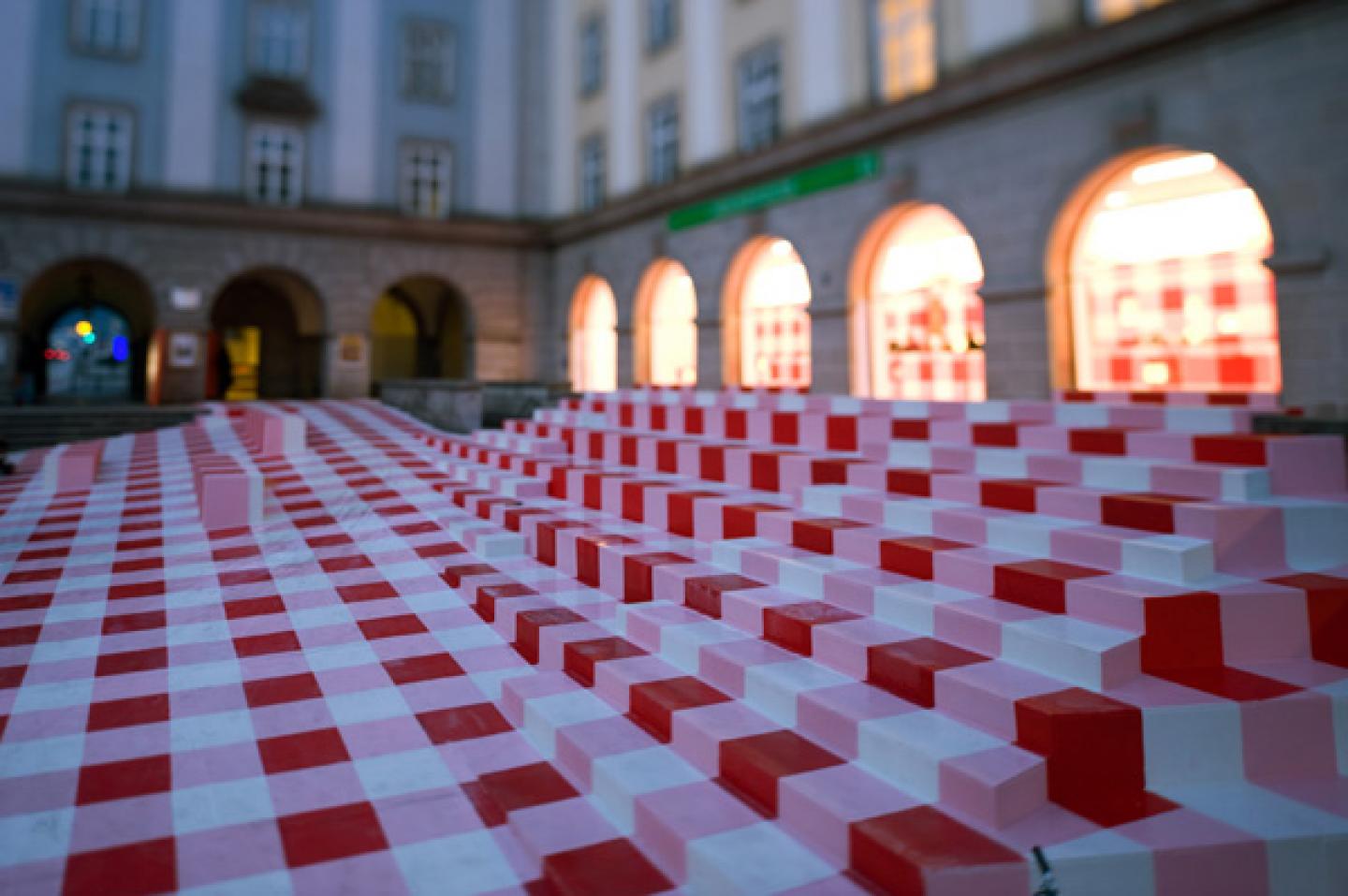 “linz ist provinz” – it’s a catchy phrase, and it’s true too: linz is unmistakably provincial. and one thing that definitely won’t work is for linz to try to present itself as urban and “chic.” our design involves a tongue-in-cheek reference to regionalism and a welcoming gesture wrapped into one: the red-and-white checkered tablecloth as a symbol of hospitality. the visitor is confronted with only this enormous tablecloth; there is no other information inscribed on billboards, banners, or building façades – the infopoint information office should be self-explanatory…