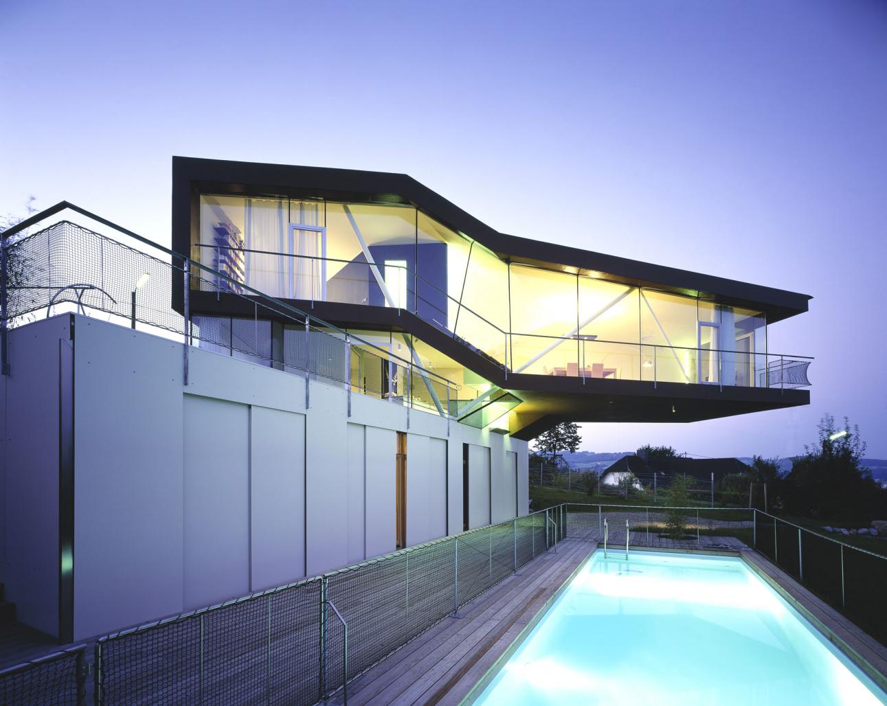 the constuction of the building is reinforced concrete in combination with a slender steel construction (15 cm in diameter) which allows a cantilever of 13,5m for the floating living room.
