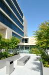 The building is L shaped in arrangement with a six storey wing on its western side enclosing a landscaped south facing public courtyard. A two storey horizontal wing encloses the space to the north. Custom designed benches and planters are placed throughout this space providing visitors to the complex with a major new amenity. The provision of this new public space is made possible by locating the large book processing facility and archive storage below the courtyard level.