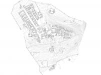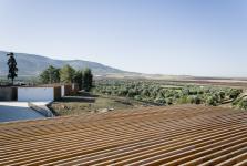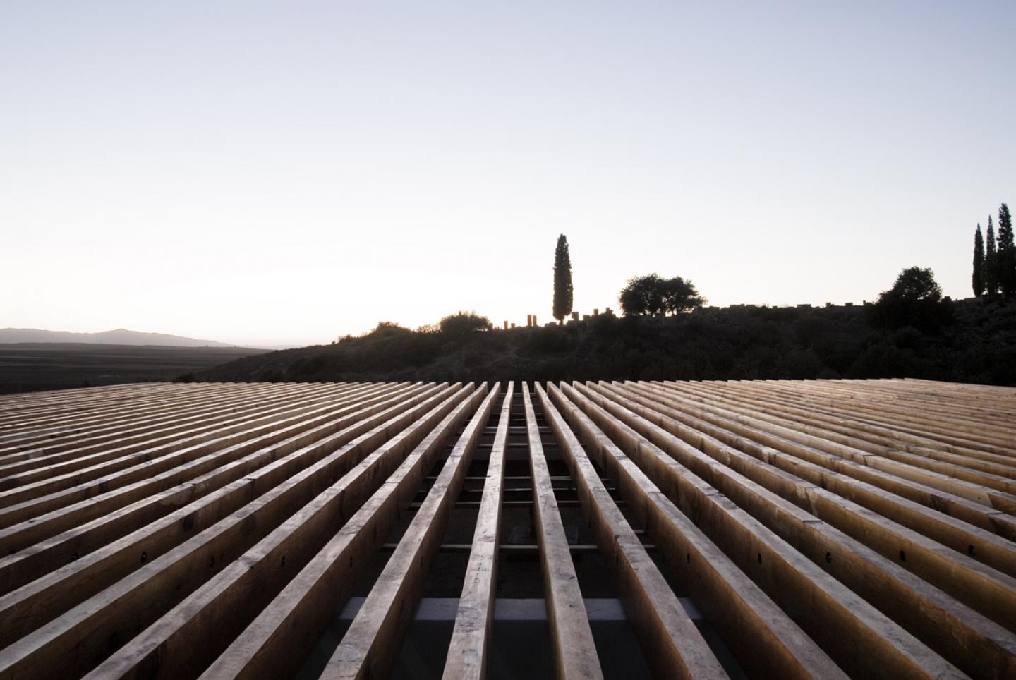 the project is conceived as a narrow imprint on the perimeter of the ancient territory, eight meters wide by two hundred meters long. the building consists of a succession of wooden volumes along an extended retaining wall, simultaneously buried and suspended in relationship to the rolling landscape. the project behaves much like the ruins it houses, and the tectonics of its construction and the lifespan of its materials inherently propose a strategy for the building’s eventual disappearance.
