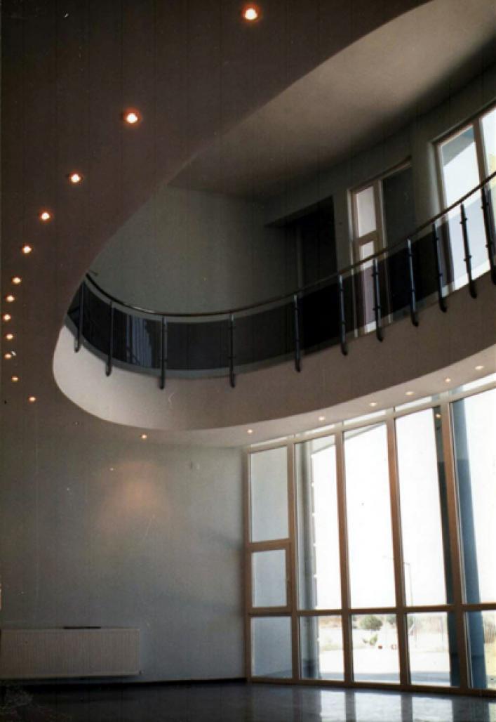The factory sells elevator engines and room air fans for the market. The first design concept began from creating the engine’s bobbin look in the middle of the building’s front façade. It would give the elliptic open space to entry and waiting area at interior too. Entry hall opens to ceiling in both 2 stories and both surrounding circulation areas serve as exhibition space for factory products.
