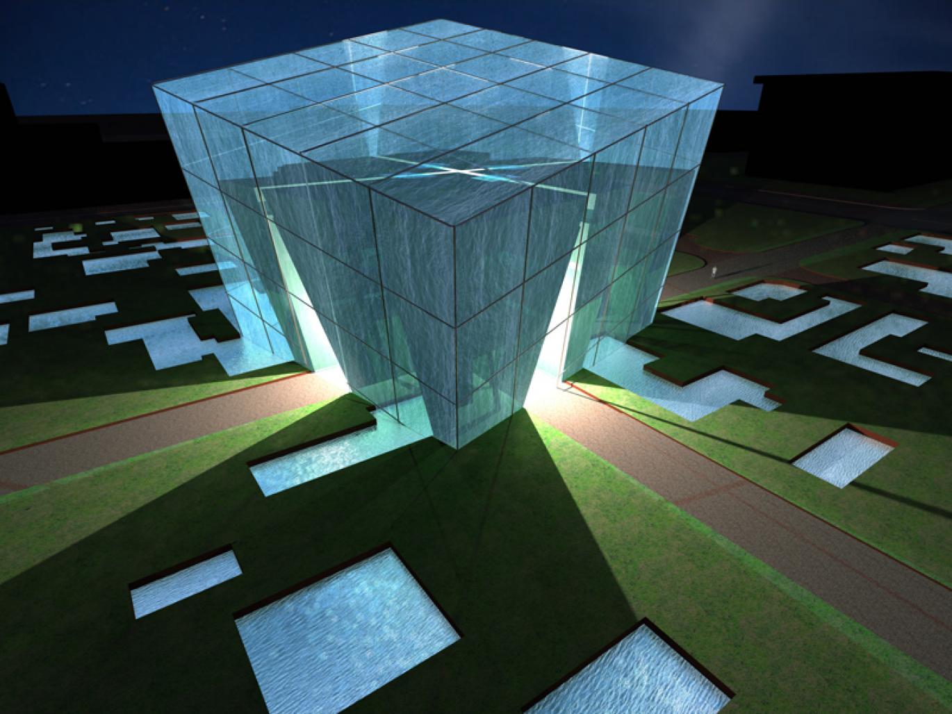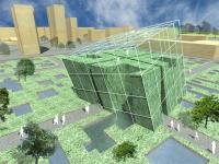 The project is a concept for ISOVER central office in Bulgaria - country that has it is own climate characteristics – four different seasons. The site for Isover’s office building is located on a former gypsy ghetto. It’s near the centre of the capital Sofia, with a park on the south and with a boulevard on the east. The project configurates the signs of the gypsys’s houses as water mirrors with the same contour and continues the park northwards,connecting the green areas.The project is inspired from both cultural and natural characteristics of the site. The vitality and the human scale of the gypsys; the thermal water- typical for the city since antiquity and the park are interpreted. Morphology : the task for Isover’s central office and the use of geometrical simple volumes for passive house led me to the use of cube.The cube is rotated in all three directions on 12 degrees – an angle which is set in the city planning of the city since antiquity. Isover’s main purpose is to insulate, to cover and my building has the same function. The workspaces are enveloped by a green vegetative skin, which is covered with a glass cube. There’s an air mass between the two cubes, working as an intermediate zone.The green cube contains 3 floors – the first consist the public space. On the second and the third floors are the workspaces. The human scale of the gypsys is interpreted in the small work groups of 4 to 6 people. There’s a garden on the roof. The research led me to the following shape – a segmented building with different view each season, covered by a glass skin. The volume that looks solid from outside, should be transparent through the windows from inside.The most interesting part comes at last. Besides all the standart passive house systems, the building offers an alternative way of heating and cooling. During the cold days or nights the double skin of the glass cube will be filled with hot thermal water for cooling and opposite – in summer it will be filled with cool rainwater, stored in the water mirrors.