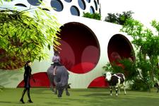 Residents can order biological food every day by computer. Vegetables and fruits grow in the collective garden and in the greenhouse on the roof. Meat will come from the sheep, cows and chickens that live in the collective garden. These animals will provide all kinds of products and will also keep the grass short. In this way there is no need for packaging food and there is no transport. The food is being cooled in the basement of the building and sold in the retail stores at the ground floor.