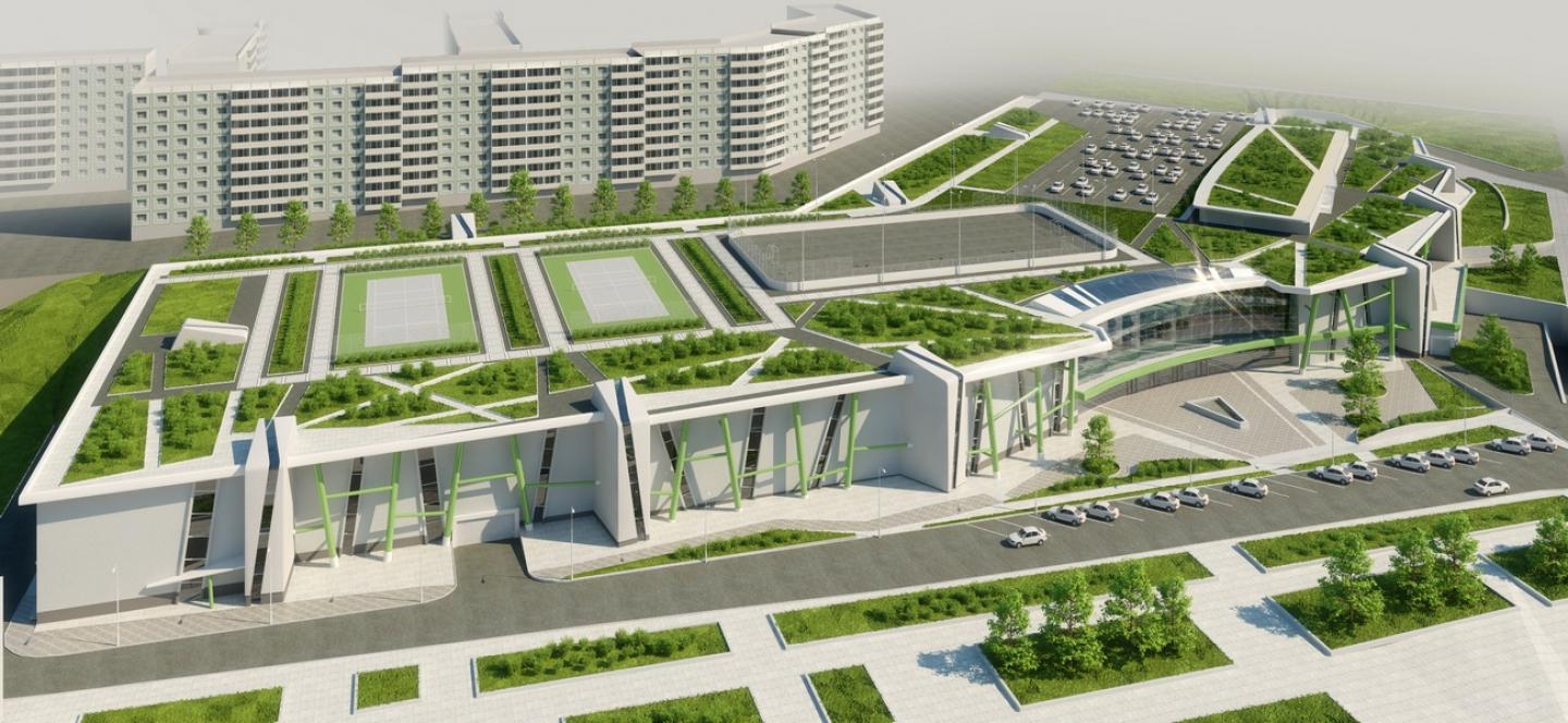 The main point of design was to place shopping mall into waste plot of land and at the same time to save recreational space for the residental surrounding.