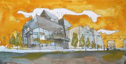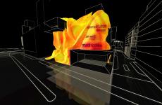 In the Information Technology era it gives a strong image of this contemporary House of Culture. On this drapery skin can play digital images, paintings, writings.