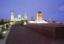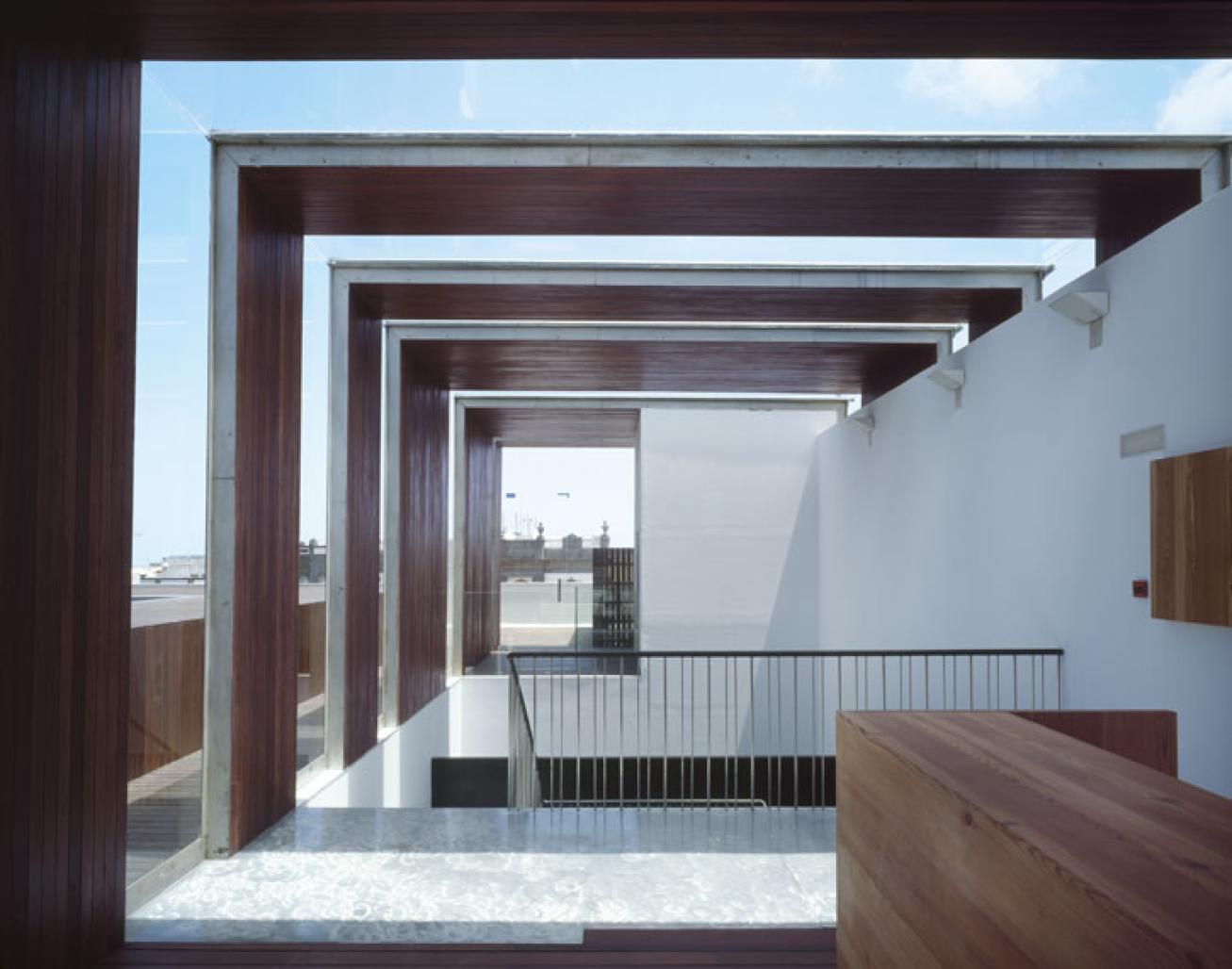 The structure of the new courtyard, of recycled timber with a very deep section, is achieved by a superposing of elements that do not coincide vertically, like a stack of open wooden cages. To a certain extend the traditional Canary Islands courtyard has something of this vertical non-coincidence of the timber elements. Here that specificity is taken as the idea out of which the design of the courtyard originates; in its superposition, this series of boxes of intensely golden old wood constructs an interior forest. For the reconstruction of the courtyard, the final phase of the project, it was considered that if the orders of architecture are an abstraction of the cabin, this architecture is an abstraction of the forest. A bar code is also an abstraction of the forest.