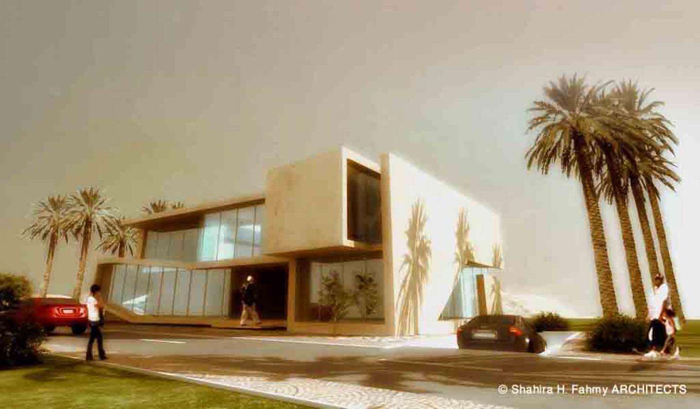 This concrete, steel and glass villa is located on a hill in a compound named “Pyramids Heights” overlooking the three Grand Pyramids of the Giza Plateau, Egypt.