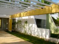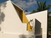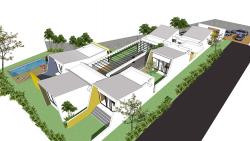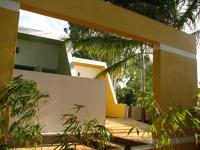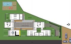 This structure is laid along north and south axis. With every room opening to north or south sides to use the diffused light. This structure is divided into two sections. First one consisting of a living room with 2 bedrooms. The other section consists of a family room with a bedroom and kitchen and dining.The first section could be used only when one family (smaller group) wants to stay there with access from outside to the kitchen.