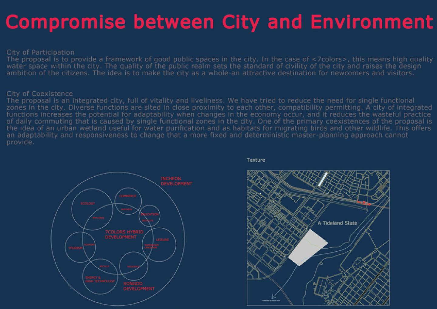 The proposal is an integrated city, full of vitality and liveliness. We have tried to reduce the need for single functional zones in the city. Diverse functions are sited in close proximity to each other, compatibility permitting. A city of integrated functions increases the potential for adaptability when changes in the economy occur, and it reduces the wasteful practice of daily commuting that is caused by single functional zones in the city. One of the primary coexistences of the proposal is the idea of an urban wetland useful for water purification and as habitats for migrating birds and other wildlife. This offers an adaptability and responsiveness to change that a more fixed and deterministic master-planning approach cannot provide.