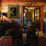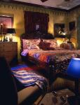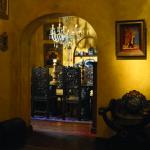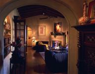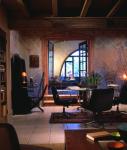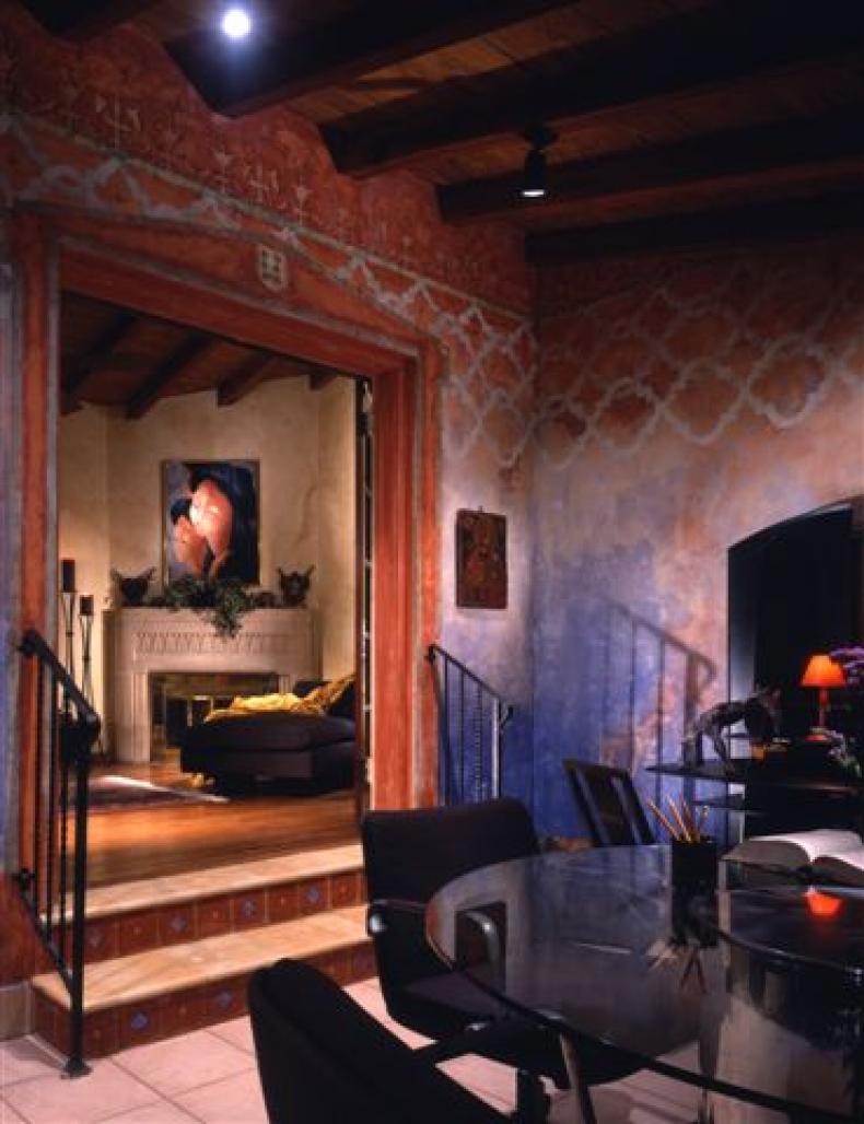 Faux painting by artist Emil Bodourov was applied to the existing handmade skip trowell stucco walls Davila specified a more subtle, elegant faux design for both the dining and living rooms using off white linen flat paint with saddle glaze and matte sealer. Details were actually etched into the original paint exposing the unique green color used back in the 1930s !For the family room, Davila specified a most unorthodox design application inspired by the weather worn walls of Europe and Latin America. Lime paint was originally brought to Latin America by the Europeans. The weathered look on the family room walls was achieved by hand rubbing lime paint color over color, trimmed at the top with repeated patterns borrowed from old churches and museum ceilings seen in Cuzco, Peru. Faux painted door surroundings flank dark wood stained French doors. In the bedroom, Davila specified a Gothic feeling for the design combined with marigold yellow walls and green trim with brown and red flowers, making a rather small, uninteresting room grand yet playful.