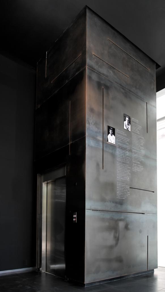 The access to the wine cellars through an oblique tunnel made of glass is wrapped in steel