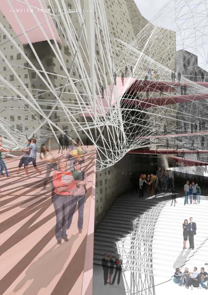The structure of the school is repeating the rectangular grid structure of the city which has been developed through the history. Thereby, a big volume of the building cut into small rectangular pieces with changing heights, provides the integration with the existing city. Open space visually lighten the mass of the school. But behind the visual openness building is collected together due to the number of horizontal and vertical connections, such as bridges, passages or system of staircases.
