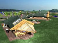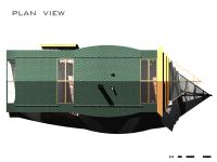 Motel`s dwelling house. House`s roof unifies spaces of garage, dwelling part & terrace. These three elements are situated endwise (along one axis).