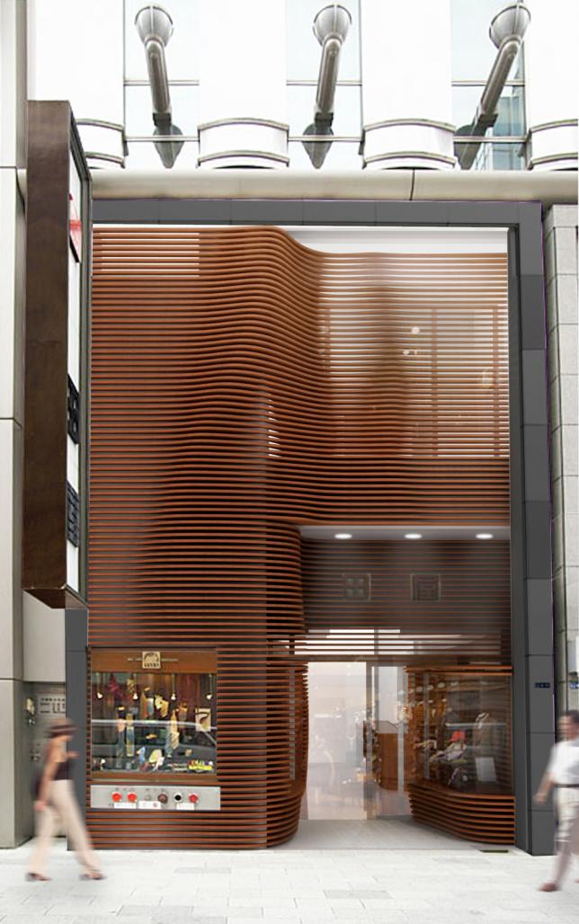 This design applies digital fabrication method to create series of wooden louvers that are generated from the three dimensional surface. The storefront façade gives Taya different depth to adopt its tradition and new development of Ginza. The interior finishes of the retail space utilize the existing cabinets as salvaged materials for new design.