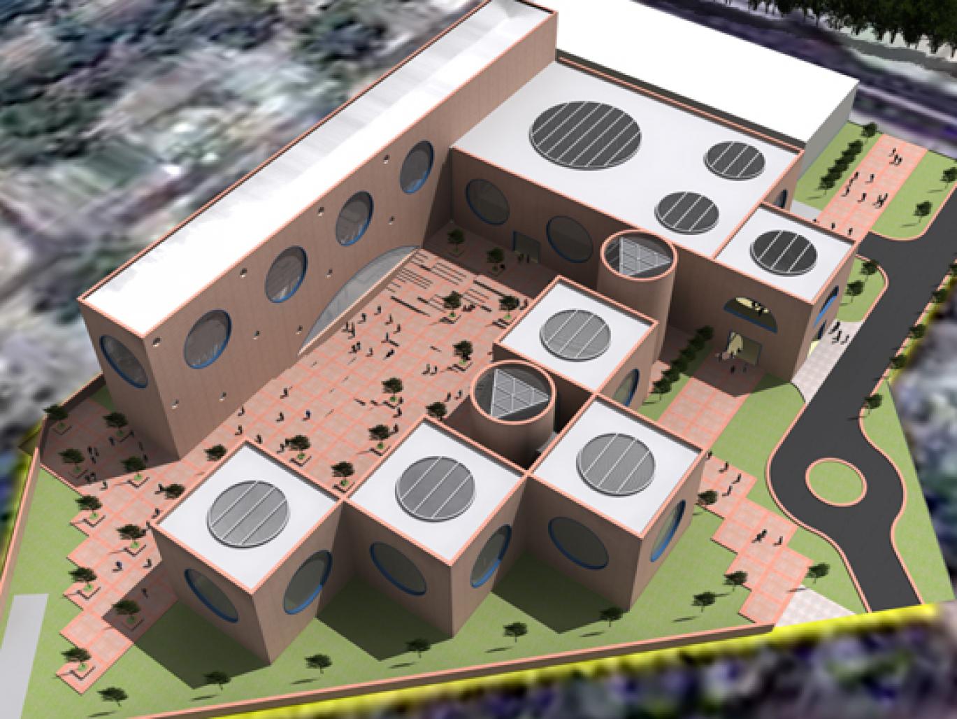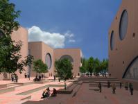 There are four cubical blocks serving as art galleries with central skylights bringing in ambient light into the spaces. A large auditorium for 500 people enclosing a stepped courtyard flanked by a block that houses in its lower floors a restaurants, library, cafeteria and 54 well appointed rooms in the upper floors for the state guests. A large piazza sits majestically between the various blocks creating a podium garden for outdoor over the invisible three level basements for 250 cars and other utility services.