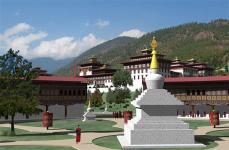 The circular shape is symbolic of the Buddha himself who was known as a flying wheel, or chakravartin, who could cut through ignorance and spread enlightenment. The parts of the wheel also symbolize the phases of a monk’s evolution, with the hub symbolizing ethical principles. The eight spokes reflect the eight fold path, as well as the spreading of the teachings. Finally the rim signifies meditative concentration and discipline. In the design, which has been approved by his majesty and Bhutan’s spiritual leader, the je kenpo, there is an opening toward the pointed apex of the main temple of Bhutan, the sacred utse! The dharma sthal sits in a “deer park,” reminiscent of the deer forest at sarnath where lord Buddha revealed the four noble truths and the eight fold path in his sermon of the turning of the wheel!
