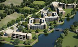 The Residential Village creates a major dining cum recreation facility; two hostel quadrangles of ground plus three levels, and an Executive Training Centre with 24 suites, 164 single rooms and a variety of dining, lounge and training facilities. Each hostel quadrangle houses common study and recreation facilities on the ground level, and 173 private rooms on the upper levels for a total of 346 rooms. The dining facility accommodates 400 covers at one time on the ground and first floor levels, and a large recreation hall on the upper level. The Residential Village opens through landscaped terraces and gardens to placid lotus ponds and a verdant landscape. The Residential Village is connected to the Academic Quadrangle by an iconic tubular steel pedestrian bridge, crossing a 150 foot wide water pond. These facilities allow 500 new program participants to live within the campus.