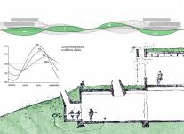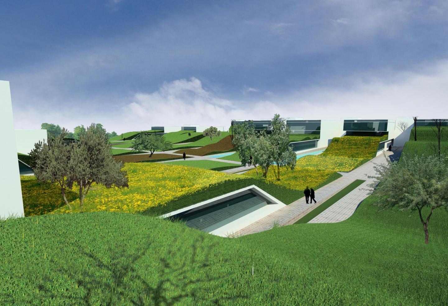 The Office complex uses environmental design to temper extreme climate changes prevalent in the region. The low built-up requirement resulted in a built form and landscape shaped by laminar flow. The design of the complex is a marriage of traditional berming techniques and contemporary technology to achieve sustainability. The design transcends the established program by looking at how environmental design can be demonstrative in terms of performance, production, and community building.